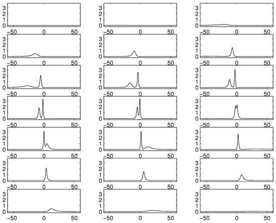 Figure 6 demonstrates two solitons in collision, where , , and . As in the undeformed case, the faster soliton passes through the smaller one elastically, without losing its shape.