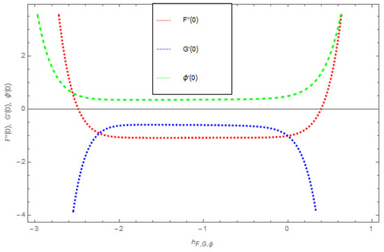 In this segment we graphically discussed the superior effect of the concerned parameters. The convergence of Equation (36) was subjected entirely through the auxiliary constraints . This is a collection in a way that it controls and converges the series solutions. The optional division of was plotted through -curves for the ordered approximated solution of HAM. The operational region of is . The convergence of HAM through the -curve on velocity profile , temperature profile and concentration profile is presented in Figure 1.