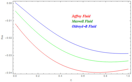 In this segment the impact of emerging parameters on velocity function , temperature function and concentration function within the defined domain have been discussed. The impact of on is deliberated in Figure 2. The Lorentz force theory deliberated that the magnetic field grows at a reversed force to the fluids flow. This force reduced the momentum boundary layer while it improved the thickness of the boundary layer. Therefore, with the escalating magnetic field the velocity profile declined. From here we concluded that Jeffrey nanofluid was greatly subjected by the magnetic field compared to the other two. In Figure 3 and Figure 4 the impact of and on were presented respectively. In Figure 3 we perceived that diminished with the rise in . Physically the thickness of the boundary layer increased with the reduction in thermal diffusion. In addition, it can also be seen from the figure that is more effective on Jeffrey and Maxwell nanofluids compared to the Oldroyd-B nanofluid. In Figure 4 the effect of thermal relaxation parameter on has been described. From here we saw that reduced with the escalation in . This was attributable to the fact that as we escalate , the material particles need more time for heat transmission to its nearest particles. In addition, it can be stated that this material shows a non-conducting behavior with higher values of which results in a reduction in . The impact of , and on are schemed in Figure 5, Figure 6 and Figure 7 respectively. In Figure 5 the effect of on has been described. Schmidt number is the ratio of momentum diffusivity to mass diffusivity. Physically, the Schmidt number is related to hydrodynamic layer’s thickness and boundary layer. The escalating intensifies the momentum of the boundary layer flow which results in an increase in concentration profile. It is clear from the figure that upsurges with the rise in . In Figure 6 the impact of on has been described. From here we concluded that larger K results in a reduction in . This may have been caused by the fact that the reaction rates controlled the diffusion coefficients. To a certain extent similar results are displayed in Figure 7. In Figure 7 the impact of on has been described. From this figure we have concluded that the growing values of showed a drop in behavior in . This results from an agreement with the general physical behavior of the homogeneous reaction and the heterogeneous reaction . In Figure 8 and Figure 9 the impact of on and for Jeffrey, Maxwell and Oldroyd-B nanofluids have been described. It is clear from the figures that the growing values of were decreasing for both and . The magnetic field was applied perpendicular to the flow of fluids and had an inverse variation with the skin friction of the fluid flow. This is the reason why the increasing magnetic field reduced the skin friction of the fluids flow. Similarly, the behavior of the heat transfer rate was due to the growing magnetic force on the fluids flow phenomena, with the fluid particles requiring more time to transfer the heat to the nearest particle. This was because the heat transfer rate reduced with the escalating magnetic field. The impact of Pr and on for the nanofluids flow has been described in Figure 10 and Figure 11. From here we have concluded that the escalation in Pr increased the heat transfer rate while the increased reduced the heat transfer rate for the nanofluids flow. Figure 12 shows the Total Residual error for the three types of nanofluid flow.