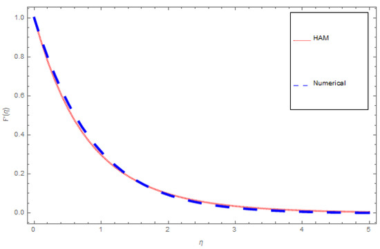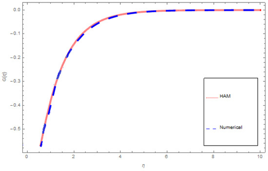 An analytical solution means an exact solution. To study the behavior of systems, an analytical solution can be used with varying properties. Regrettably there are many practical systems that lead to an analytical solution, and analytical solutions are often of limited use. This is why we use a numerical approach to generate answers that are closer to practical results. These solutions which cannot be used as complete mathematical expressions are numerical solutions. In the natural worldthere are almost no problems that are exactly solvable, which makes the problem more difficult than all the exactly solvable problems. There are three or four of them in nature that have already been solved, unfortunately even numerical methods cannot always give an exact solution. Numerical techniques can handle any completed physical geometries which are often impossible to solve analytically. In this article both analytical and numerical approaches are tested to solve the modeled problem. A comparison of HAM and ND-Solve technique for , and are deliberated in Figure 13, Figure 14 and Figure 15 and Table 4, Table 5 and Table 6, respectively.
