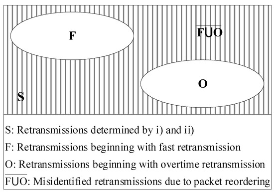 As shown in Figure 2, to exclude the effect of packet reordering, instead of adopting the L-Rex’s traditional way of identifying retransmissions coarsely, we further refine the loss set determined by (i) and (ii) to screen out the retransmissions belonging to set F∪O. If N and M denote the number of fast loss events and the number of overtime loss events in a TCP connection, respectively, then the number of retransmissions belonging to set F∪O (i.e., the retransmissions used for repairing the loss events in a TCP connection) can be calculated as