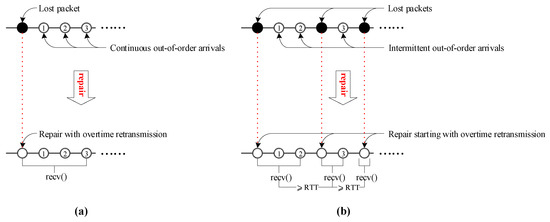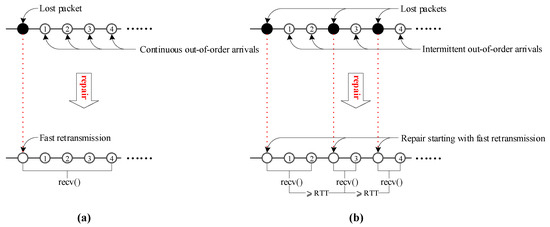 Figure 3. Fast loss event scenario. (a) Continuous out-of-order arrivals; (b) Intermittent out-of-order arrivals. - Form 2: The out-of-order arrivals are intermittent (discontinuous) and need at least two recv()s to be returned to userspace; the first recv() is triggered by a fast retransmission, while the time interval between the subsequent recv() and the previous recv() is greater than RTT. For instance, in Figure 3b, the four out-of-order arrivals triggering fast retransmission require calling recv() three times to return to user space. In this case, the recv () triggered by the first fast retransmission returns a fast retransmission and the first two out-of-order arrivals; after RTT, the recv() triggered by the second retransmission returns a retransmission and the third out-of-order arrival; after another RTT, recv() triggered by the third retransmission returns a retransmission and the fourth out-of-order arrival.