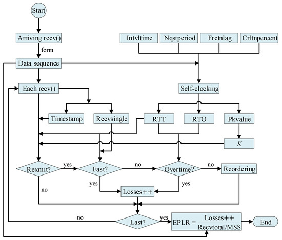 Follow the loss detection process shown in Figure 5, we implemented IM-L-Rex. Specifically, within the time interval Intvltime (500 ms), the self-clocking-based RTT estimation firstly operates on the data sequence formed by the arriving recv()s to get the dynamic RTT. To improve the RTT estimation accuracy, the parameters Nqstperiod, Frctnlag, and Crltnpercent are used to exclude the negative effects. Among them, Nyquist is used for correcting the small lags caused by the noises like competing traffic, back-to-back received packets, and other network conditions disrupting the burst-gap patterns. In our implementation, the lags less than min(Nyquist period, 10 ms) are not considered. Frctnlag and Crltnpercent are set to 1/4 and 75% to exclude the effect of strong autocorrelation at multiples of the RTT. Furthermore, when estimating RTT, the parameters RTO and K deduced from Pkvalue are also obtained synchronously. Then, for the data returned by each recv(), we determine whether it indicates a likely retransmission by using the parameters Timestamp, RTT, and K. If it does, we further determine whether it indicates a packet loss by means of the relevant parameters RTT, Recvsingle, and RTO (i.e., the parameters RTT and Recvsingle for fast loss event, and the parameters RTT and RTO for overtime loss event). After that, we divide the total number of packets (Recvtotal/MSS) by the estimated number of packet losses (Lossnum++) to get the EPLR. Finally, the algorithm IM-L-Rex is shown in Algorithm 1.