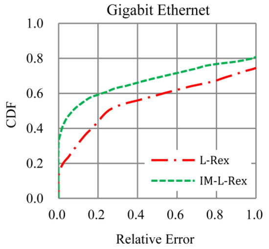 L-Rex is designed and optimized based on fast Ethernet and ADSL. As we know, ADSL is rarely used nowadays. Correspondingly, the experimental results in Figure 7 are all derived from the TCP transfers whose clients are located in fast Ethernet. To verify the performance of IM-L-Rex in other current mainstream access networks, we also compared L-Rex and IM-L-Rex in gigabit Ethernet. For the sake of highlighting the advantages of L-Rex, we chose TCP transfers with a file size of 1 MB and a packet loss rate greater than 10−3, for experimental comparison. From the result in Figure 8, we can see that the accuracy of L-Rex in gigabit Ethernet is worse than that in fast Ethernet. The error mainly stems from the limitations of the static parameters optimized in ADSL and fast Ethernet, i.e., in gigabit Ethernet; the difference in the number of bytes received by each recv() is higher than that assumed by L-Rex. In this case, the parameter values of 1% and 0.7 may be too strict. In comparison, in Figure 8, the accuracy of IM-L-Rex based on dynamic parameters is comparable to that in fast Ethernet and is not affected by the specific level 2 connection type.