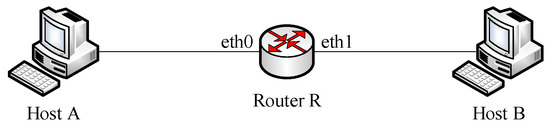 In this subsection, we use testbed measurements to investigate the performance of IM-L-Rex in processing packet reordering. The testbed shown in Figure 9 consisted of three fedora8 virtual machines installed on the fedora17 operating system: host A, host B, and router R. We used GNU Zebra to emulate and configure the router, while the packet reordering and random packet losses are added to network interface eth1 with Netem. Corresponding to the scenario in Figure 9, the specific testbed parameters are shown in Table 4. In the previous experiments, we verified the performance of IM-L-Rex under fast Ethernet and gigabit Ethernet, while here the link bandwidth is set to 10 Mbps to further verify the robustness of IM-L-Rex under lower bandwidth. Also, the 10-second random-data TCP download is consistent with the fact that most application level tools run their tests for a fixed number of seconds (typically 10) [7].