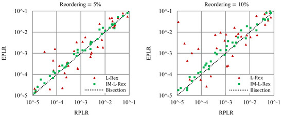 The simulation results of L-Rex and IM-L-Rex under different reordering rate (the proportion of data packets reordered during a TCP transfer) are shown in Figure 10. The application-level packet loss rate, in the actual network, typically spans several orders of magnitude. Accordingly, in the final experiment results, five to 10 TCP transfer samples were selected for each order of magnitude to investigate the effectiveness of our strategy used for excluding packet reordering. In Figure 10, the dashed bisector line represents the exact prediction, and the closer the points are to the bisection, the more accurate the corresponding model is. From Figure 10, we can see that, on the whole, the points of L-Rex are scattered on both sides of the bisection, while the points of IM-L-Rex are mainly located above the bisection and are closer to the bisection than L-Rex. Moreover, we can see that, as the proportion of packets that suffer reordering increases, L-Rex becomes less accurate, while IM-L-Rex is relatively accurate. All this indicates that our strategy is effective; in other words, IM-L-Rex is more robust than L-Rex in the face of packet reordering. Meanwhile, the points scattered on both sides of the bisection imply that L-Rex sometimes overestimates and sometimes underestimates, while the points above the bisection indicate that IM-L-Rex will produce overestimates in most cases. The phenomenon behind L-Rex further illustrates that the static parameters of L-Rex are unable to adapt to the dynamic and complex network conditions. As for the reason why IM-L-Rex always outputs overestimates is that IM-L-Rex also utilizes retransmissions to realize loss estimation; although the estimation of IM-L-Rex is closer to the actual number of retransmissions, the spurious retransmissions included in retransmissions inevitably skewed the estimation of IM-L-Rex and produced the overestimates. Moreover, the results in Figure 10 also show that L-Rex performs poorly at low RPLR, which may be owing to the static parameter values (i.e., 1% for H and 0.7 for K) optimized under moderate losses.