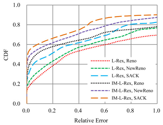 In order to check how TCP variant influences the proposal, we carried out experiments with the same set-up shown in Figure 9 to compare the performance of IM-L-Rex and L-Rex under different TCP variants (i.e., Reno, NewReno, and SACK). Unlike the parameters in Table 1, we did not add packet reordering to the network interface to focus on the effect of the TCP variant itself. In Figure 11, the experiment results can be seen. It can be seen that, regardless of IM-L-Rex or L-Rex, in terms of overall estimation accuracy, SACK is best, NewReno is second, and Reno is the worst. Particularly, we can see that, although IM-L-Rex outperforms L-Rex under the same TCP variant, IM-L-Rex is not always superior to L-Rex in the entire parameter space. That is, the L-Rex under SACK is better than the IM-L-Rex under Reno when the relative error is greater than 66.43%. From these, it is inferred that different TCP variants have a great impact on the performance of IM-L-Rex.