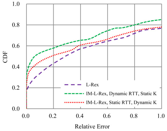 To fully evaluate IM-L-Rex, we also investigated the effects of dynamic RTT and dynamic K on IM-L-Rex. The evaluation data come from the TCP transfers under NewReno version in Section 5.2.2, and the experiment results are shown in Figure 12. Comparing L-Rex and “IM-L-Rex, Dynamic RTT, Static K”, we can see that the dynamic RTT has a certain improvement for the estimation accuracy of L-Rex. Similarly, the comparison of “IM-L-Rex, Dynamic RTT, Static K” and L-Rex also illustrates that the dynamic K has a certain improvement for the estimation accuracy of L-Rex, but its improvement effect is less than that of dynamic RTT. This indicates that, for IM-L-Rex, RTT is a more critical parameter than K, which has the more important role in the estimation accuracy.
