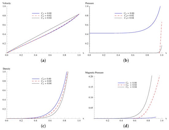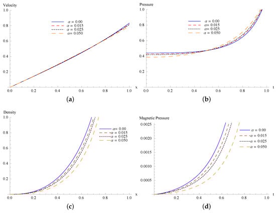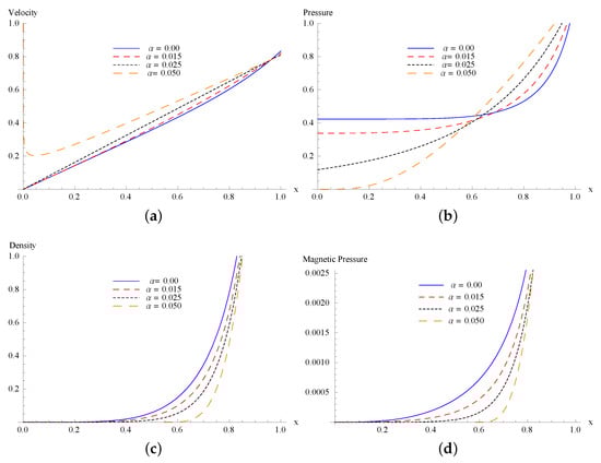 Schematic of non-dimensional (a) velocity , (b) pressure , (c) density and (d) magnetic pressure for , , and .