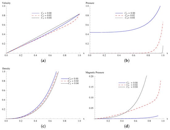 Figure 1 consists of the profiles of velocity, density, pressure, and magnetic pressure for planar shocks () with , , and . It is clearly seen from Figure 1 that the dimensionless profiles of flow variables decrease as value of parameter increases except the pressure which increases with the small increase in the parameter . This is expected physically as gas particles will collide more frequently with the increase of non-idealness which results in the rise in pressure with the increment of . In Figure 2, we observe that the pressure and density decrease as we increase the value of , while the magnetic pressure increases for planar motion after a certain point. It is again an expected result as the charged particles will be transported away very quickly with the increase of . It results in dropping in pressure after the blast. At the point of explosion, the process is not fully self-similar and therefore the initial dynamics is a bit off. It agrees with blast wave theory. It is well known that the phenomena are not self-similar at very near the center or axis of explosion. However, point explosions can be self-similar at considerable distance from the source (see Sakurai [,]). Figure 3 and Figure 4 display the profiles of the flow variables for cylindrically symmetric flow (). From Figure 3a and Figure 4a, we observed that as we increase the value of and , velocity increases. Figure 3b shows that as the value of parameter increases, pressure also increases after a certain point. This describes the physics of the post-shock process very well as increase in makes the collision of the gas particles more frequent. Figure 4b shows that an increment in the value of causes a decrease in pressure for the cylindrically symmetric flow. It is attributed to the fact that the ionized gas molecules are carried away by a strong magnetic field. It is one of the reasons that the instabilities at the shock front can be suppressed under the presence of a magnetic field. Figure 4c shows that the density of the medium decreases as increases. Figure 4d shows that as the value of increases, magnetic pressure also increases.