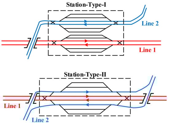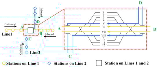 A multi-direction station is a station located on more than one railway line. We give an illustration of how two lines merge in a multi-direction station and the detailed station layout of the second case mentioned above as Figure 2. For the high-speed rail, the lines are all equipped with double-track. The considered multi-direction stations are generally symmetrical and two lines are separated by the bridge outside the station.