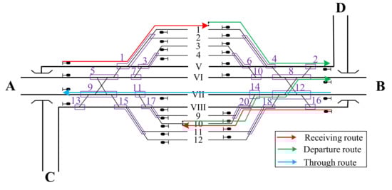 Constraints 18 represent that the train that need to be provided one static operation should be allocated to the tracks that can provide this operation. Constraints 19–20 show that nonstop trains must be assigned to main tracks and stop trains must be assigned to siding tracks, which ensures the feasibility of the track allocation plan. In practice, a train from one direction may not be able to be assigned to every track on account of the station layout. For example, the trains from direction C cannot be allocated to tracks VI, VII, VIII, 9, 10, 11 and 12 in the station illustrated in Figure 3. Constraints 19–21 make the track utilization plan more acceptable from the station layout perspective.