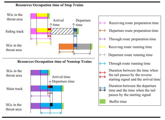 For a stop train, the resources of the receiving route in the throat area and the corresponding tracks will be claimed under the minimum receiving preparation time criterion before the arrival time given by the train diagram. When the tail of the train passes by the reverse starting signal (starting signal for the opposite direction train of the same siding track), the resources of the train’s receiving route in the throat area will be released after the buffer time and then are available for other trains. The departure route will also be locked to the minimum departure preparation time criterion before the train’s departure time. When the tail of the train passes the starting signal, the siding tracks will be available for other trains after the buffer time. The resources of the train’s departure route in the throat area are unlocked in buffer time after the tail of the train passing by the reverse home signal.