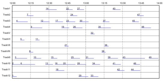 Train 35 is allocated to the track 4 under the flexible track utilization rule, which makes the value of objective function larger than the allocation if it is assigned to tracks 9–12. However, in that case, the receiving route of train 35 will conflict with others. Meanwhile, trains 9, 12, 43, 48 and 49 are turnaround trains, which cannot get a feasible solution without the flexible track utilization rule.