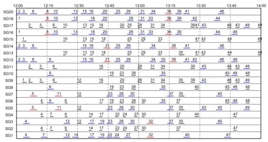 The proposed optimization model is pre-processed by the software MATLAB R2006b and then solved by the commercial solver IBM ILOG CPLEX 12.6.0 with the branch and cut method. Finally, we obtain the track allocation plan. Unlike current research, we represent the track occupation time of all trains rather than the arrival and departure time (Figure 5). To verify the model, we also give the GSs’ occupation plan (Figure 6), where black blocks represent the resources that are occupied.