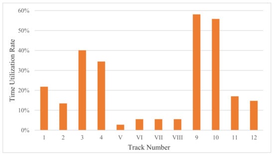 For more than 50% of tracks, the time utilization rates are between 0%–20%. In contrast, for most SG, time utilization rates are between 10%–30%. In addition, the expectation value of time utilization rates of tracks and SG are 22.9% and 25.7% respectively. Meanwhile, we compared the track allocation time with the SGs’ occupation time, the SGs in this multi-direction high-speed railway station are occupied more frequently with the increase of the number of trains from 12:30 to 13:30. This denotes that the station capacity depends on the capacity of throat area rather than station tracks. Thus, simultaneous optimization of the usage of arrival-departure tracks and resources in the throat area is significant to multi-direction stations.