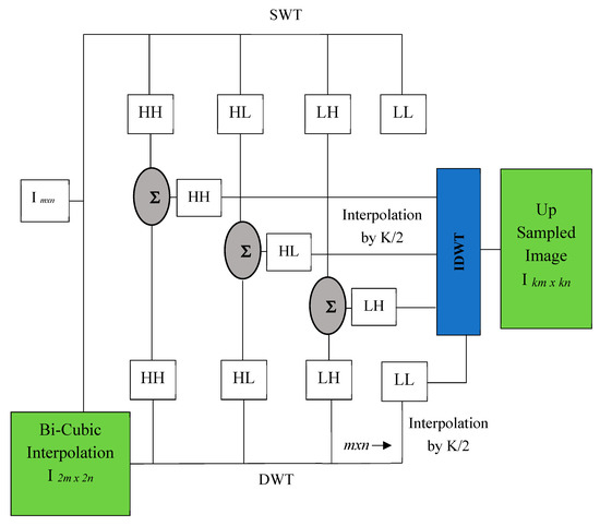 The technique proposed in [40] is used for the up sampling. Here, we applied the stationary wavelet transform (SWT) and discrete wavelet transform (DWT) on the acquired m × n dimensioned low-resolution image which produced four bands, i.e. HH, LH, HL, LL, with the similar m × n dimension as shown in Figure 2. The output of the SWT and DWT is different in terms of dimension of the low-resolution input image. The dimension of each of sub-bands is half of the dimension of the input image in DWT, however, in SWT each sub-band is generated exactly of the same dimension as the input image.