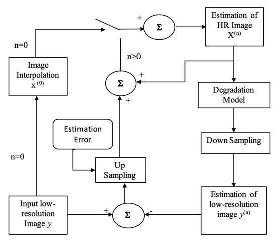 Iterative back projection is a method with low computational complexity for super-resolution that can be useful for real-time application. This technique has been proposed by [44]. IBP is very useful iteration-based method to minimize the error energy. This method is very efficient to deal with constraints like smoothness. In IBP the high-resolution (HR) image is generated from the input low-resolution (LR) image by reducing the pixels. The observed LR image is generated from the downgraded initial HR image. The simulated LR image is then subtracted from the observed LR image. The high-pass filter is used for the estimation of HR image for edge projection and back projecting the error between the observed LR and simulated LR image [45].
