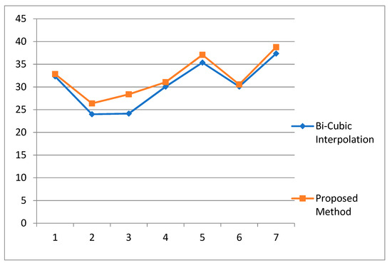 The comparison of Bicubic interpolation with the proposed method is measured with PSNR and is represented by Figure 4.