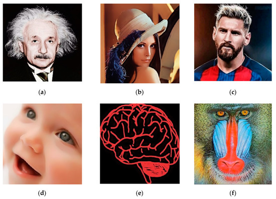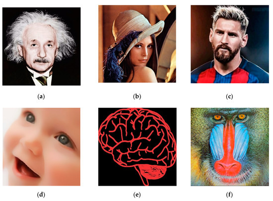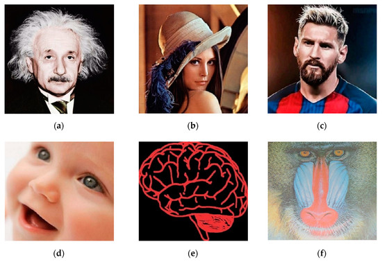 Original true color image: (a) Einstein; (b) Lena; (c) Messi; (d) baby; (e) brain; (f) baboon.