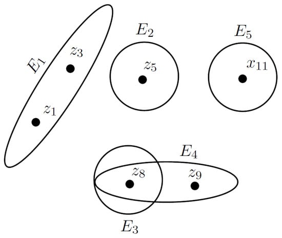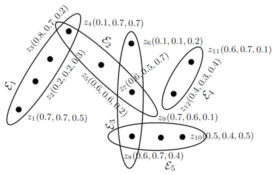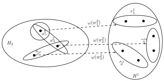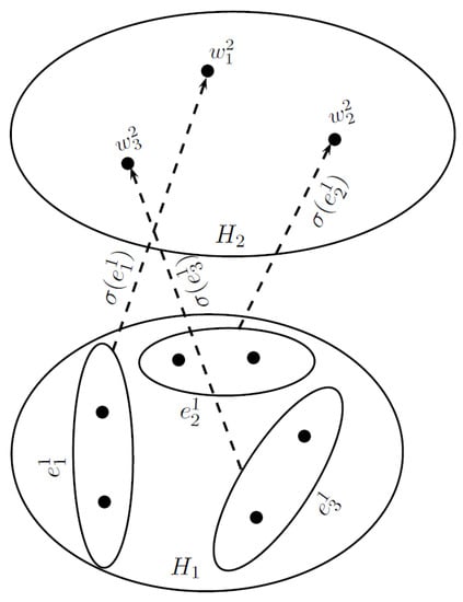 The corresponding definitions in classical hypergraph theory are completely analogous to the above Definitions 17 and 18. In a crisp hypergraph, if the hyperedges and do not intersect each other, i.e., , , and , then these hyperedges form a partition of granules at this level. Furthermore, if , , and , i.e., the hyperedges and intersect each other, then these hyperedges form a covering at this level.