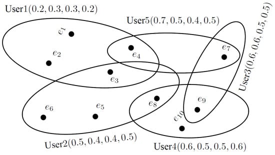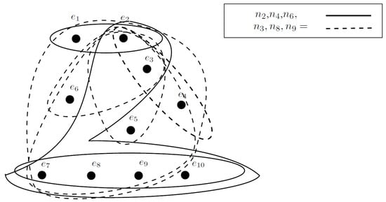 The most fertile way to direct a search on the Internet is through a search engine. A web search engine is defined as a system software that is designed to search for queries on the World Wide Web. A user may utilize a number of search engines to gather information, and similarly, various searchers may make an effective use of the same engine to fulfill their queries. In this section, we construct a GrC model of web searching engines based on four-PFHG. In a web searching hypernetwork, the vertices denote the various search engines. According to the relation set N, the vertices having some relationship are united together as a hyperedge, in which the search engines serve only one user. After assigning the membership degrees to that unit, a four-PF hyperedge is constructed, which is also considered as a granule. A four-PF hyperedge indicates a user that wants to gather some information, and the vertices in that hyperedge represent those search engines that provide relevant data to the user. Let us consider there are ten search engines, and the corresponding four-PFHG is shown in Figure 8. Note that , , , ⋯, , and , , , , .