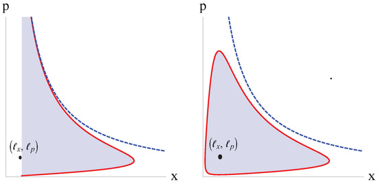 (Left): The region in shadow describes the allowed phase space with area bounded by the classical trajectory (1) with and the constraints . (Right): Same as before with the constraints .