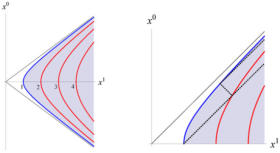 Notice that . The boundary corresponds to the hyperbola that is the worldline of a particle moving with uniform acceleration equal to (in units ). The Rindler variables are the ones used to study the Unruh effect [68].