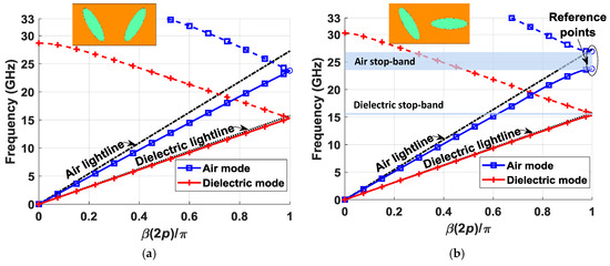 Since the proposed structure is built in two different mediums, there are two fundamental modes of propagation, one in the air gap and one in the dielectric. The mode of interest in this case is the one that propagates in the air, as it has lower losses. An example of the dispersion curves of these modes is shown in Figure 2. For a glide configuration (Figure 2a), non-dispersive modes are obtained. However, the immediate effect of the rupture of the symmetry (Figure 2b) is the appearance of stop-bands or frequency ranges in which the fields do not propagate in the chosen direction. The stop-band appears in both the air and dielectric modes, but it is wider and its effect is more pronounced in the air mode. This is because the air gap is thinner than the thickness of the dielectric, and the electromagnetic fields confined inside are more influenced by the shape of the ellipses. The rupture of the symmetry generates a stop-band for the value β(2p)/π = 1 of the dispersion diagram, as expected from a periodic glide-symmetric structure with two periodicities [10]. The reference points indicated in Figure 2b represent the upper and lower limits of the stop-band, calculated for a 180° phase difference value between boundaries in the y-direction, which is equivalent to a value of 1 normalized with respect to period 2p of the structure. In the parametric studies carried out in Section 2.1, Section 2.2, Section 2.3 and Section 2.4, these reference points are used to show the behavior of the stop-band and the refractive index. The refractive index n is calculated as the ratio of the speed of light in vacuum, c, divided by the speed of light in the medium under study, v. Equations (1) and (2) demonstrate that this is equivalent to calculating the relationship between frequency in vacuum, fv, and frequency in the medium under study, fm, for any βv(2p)/π = βm(2p)/π value of the dispersion diagram, assuming that periodicity p is the same in both cases. Since βv(2p)/π = βm(2p)/π, we have λv = λm; thus, we get Equation (2).