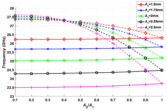 Effect of the size of the second ellipse versus the first ellipse A2/A1 for different values of A1. The rest of the parameters are εr = 3, hAir = 0.3 mm, hDiel = 1.52 mm, p = 2.75 mm, B1/A1 = B2/A2 = 0.3, φ = θ = 30°, and d = 0 mm.