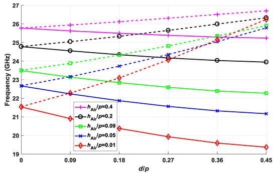 The second rupture of the symmetry relates to the displacement of the second ellipse toward the first ellipse with the period, d/p. In combination with this, Figure 4 also shows the effect of varying the thickness of the air gap normalized to period, hAir/p. The value of p is 2.75 mm for all the cases. The rupture of the symmetry is greater upon increasing d/p values; thus, the stop-band increases. Of special interest is the significant effect that reducing the thickness of the air gap has on the stop-band widening. The explanation for this phenomenon is once again that the effect of the elliptical structures intensifies when the field is more confined within the air gap. This also explains the shifting to lower frequencies for smaller thicknesses as the refractive index increases.