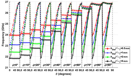 Another alternative to break the symmetry lies in the φ and θ angles at which the ellipses are oriented. Figure 5 depicts the stop-band behavior at a θ angle from 0° to 90° for φ values that also range from 0° to 90° in steps of 10°. In order to have a perspective of the effect of all the parameters of the structure, Figure 5 includes the results for various values of the thickness of the dielectric substrate normalized to the square root of its dielectric constant, hDiel/ (εr = 3). It can be observed that the curves cross each other when φ and θ are equal, which happens in cases where glide symmetry exists. Therefore, the stop-band opens for θ values that differ more from φ. The curves have a sinusoid shape associated with the rotation of the ellipses, for which only a half of the period is represented, since a similar behavior is expected in the other half (θ values from 90° to 180°). Regarding the thickness of the dielectric substrate, Figure 5 shows how the width of the stop-band increases for greater thicknesses, but this effect tends to saturate from a certain thickness. This is because the mode that penetrates the ellipses into the dielectric is an evanescent mode. Thus, when the thickness is small, the mode does not have enough space to be attenuated; however, for thicknesses greater than a certain threshold, the mode is attenuated enough so that it is not affected by an increase in thickness.