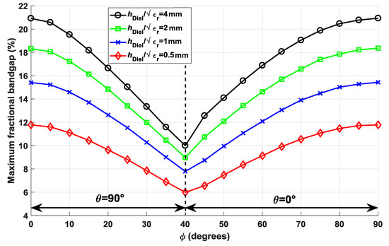 Maximum fractional stop-band found for each value of φ in Figure 5 considering different substrate thicknesses.