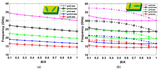 The last parametric study carried out in this work relates to the period of the structure with stop-band frequency displacement. Different values of period p were taken with the corresponding scaling of the ellipse dimensions to preserve the percentage of area occupied by the ellipses in the unit cell. The parameters of the reference structure for this stop-band study are as follows: hAir = 0.3 mm, hDiel = 1.52 mm, A1 = A2 = 2.5∙(p/2.75) mm, and d = 0 mm. A parametric sweep of the B1 and B2 values was also included in the study, so that the ratio of the semi-minor and semi-major axes B/A (B = B1 = B2; A = A1 = A2) of the ellipses varied from 0.1 to 1. The results are shown in Figure 7a,b. Figure 7a contains the dispersion diagram value at β(2p)/π = 1 of a structure with glide symmetry (φ = 30°, θ = 30°). The analysis on a broken-symmetry structure (φ = 0°, θ = 90°) is depicted in Figure 7b.