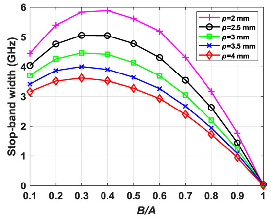 It is characteristic of periodic structures that the frequency behavior is inversely proportional to its period. Thus, in Figure 7, it is observed that the modes move downward in frequency with the inverse of p. In the glide-symmetric configuration, there is no stop-band; thus, in Figure 7a, only one curve is represented for each periodicity value p. It is interesting to note that, when the B/A value is higher, the frequency of the modes decreases, i.e., the refractive index increases. This is because the interaction of the electromagnetic fields with the dielectric material increases as a result of the reduction of the metallic surface. With respect to the non-glide configuration of Figure 7b, both the curve for the starting frequency (solid) and the curve for the ending frequency (dashed) of the stop-band are represented. The pattern is similar to the behavior of the glide configuration with the increase of the B/A value. However, there is a variation in the width of the stop-band that reaches its minimum when B/A = 1, in which we recover the symmetry and the stop-band disappears. Figure 8 represents the width of the stop-band obtained in each of the p values represented in Figure 7b. It is clearly observed that the maximum width of the stop-band is achieved for B/A values ranging between 0.3 and 0.4.