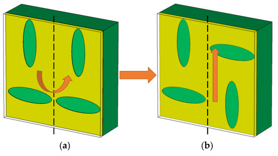 The non-glide-symmetric structure in Figure 7b mirrored using a different symmetry axis (a); the new glide-symmetric structure (b) is obtained from (a) after applying a translation.