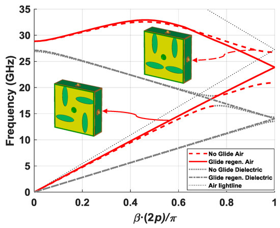 Figure 10 depicts a comparison of the dispersion diagrams obtained with the unit cells of Figure 9a,b. The main stop-band present for β(2p)/π = 1 in the non-glide unit cell, from 20.92 GHz to 26.76 GHz, closes completely by regenerating the symmetry. Another interesting effect on non-glide structures is the appearance of an additional stop-band produced by the merging of the forward mode in air with the reverse mode in the dielectric. In the example shown in Figure 10, this occurs for values around β(2p)/π = 0.75. This type of stop-band was explained in Reference [31] as a complex mode that propagates in the structure. This additional stop-band is also completely closed in the glide configuration.