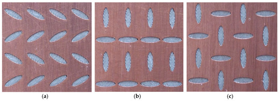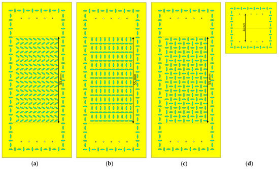 Four designs were made for the experimental demonstration. In three of them, we used the unit cells shown in Figure 11, which corresponded to the glide configuration (Figure 10), the non-glide configuration (Figure 11b), and the configuration with regenerated glide symmetry from a non-glide configuration (Figure 11c). The parameters chosen for the designs were εr = 3.66, hAir = 0.2 mm, hDiel = 1.52 mm, p = 2.75 mm, A1 = A2 = 2.5 mm, B1 = B2 = 0.75 mm, and d = 0 mm. The only values that were different were φ and θ, taking φ = θ = 30° for the glide configuration and φ = 0°, θ = 90° for the non-glide and regenerated configurations. The glide (Figure 12a) and non-glide (Figure 12b) designs contained 10 × 10 unit cells, whereas the design with regenerated symmetry (Figure 12c) contained only 5 × 10 unit cells due to the unit cell being twice as wide. The fourth design (Figure 12d) was a supporting structure that acted as a “thru” and that was used to make phase corrections in the measurements of the other three designs. The prototypes were excited by 10 coaxial connections, five on each side, to create a plane wave that emulated the boundary conditions used in the analyzed unit cells. It should be noted that we added a non-glide frame of ellipses around the four designs to prevent the propagation of spurious modes between the metal surface of the dielectric substrate and the aluminum casing that shielded these designs. As we can observe in Figure 12, the total length of the surface with ellipses was 55 mm (each unit cell was 5.5 mm in length), but the distance between the coaxial connectors and the ellipses was 24 mm in total. This is the separation that should exist between coaxial inputs and outputs of the “thru” for a correct post processing of the measurements.
