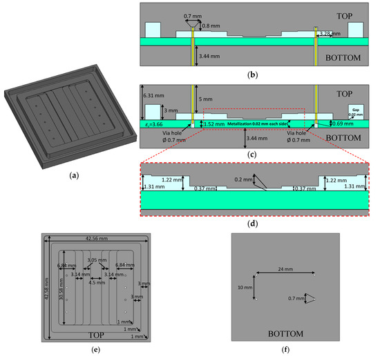 Two metal casings, one top and one bottom, covered the dielectric sheet. Ten coaxial connectors were inserted in these casings, six in the top casing and four in the bottom casing. In this way, the excitation at the input through five coaxial probes was achieved by alternating the up–down orientation of the connectors, as can be seen in the Figure 13. By introducing three probes from the top and two from the bottom, it is possible to achieve a separation between contiguous probes of 5 mm, which coincided with half a wavelength in free space at 30 GHz. This ensured a good plane wave across the desired frequency range, between 20 and 30 GHz. Since the base size of the coaxial connectors was 9.5 mm, it was impossible to achieve this separation by inserting the probes on one side only. Therefore, the purpose of these metal casings was threefold. First of all, the 2.92-mm coaxial connectors could be screwed on. Secondly, the internal shape of these casings provided an acceptable matching of the complete prototype between 20 and 30 GHz, as the phenomenon to be demonstrated occurred between these frequencies. Finally, the thickness of each casing (top and bottom) was such that the phase difference between the external surface and the inner surface was the same to ensure that all probes excited the structure in phase. For this, both the thickness of the dielectric and the metallization of both sides of the dielectric were taken into account. All dimensions of the metal casings are shown in detail in Figure 13. The internal structure of the top casing is shown in Figure 13a. This part corresponds to the design of the “thru”; thus, its length was smaller than for the other designs. In particular, this casing increased its length by an additional 55 mm while keeping the 0.2-mm gap in the center of the piece. There was a staggered shape from the input and output with the five holes for the coaxial probes to the central area with the gap of 0.2 mm. In the design, a 3-mm corrugation was introduced along the entire edge, which corresponded to approximately a quarter wavelength at the central frequency. This allowed the short to be transformed into open and again into short-circuit in the internal boundary of the casing, ensuring good electrical isolation of the fields. Figure 13b represents a lateral cut of the complete “thru” design where the coaxial probes entered from the bottom side. Similarly, Figure 13c shows another lateral cut in which the coaxial probes penetrated from the top side. All holes in the dielectric substrate with a diameter of 0.7 mm were metallized to preserve the coaxial structure when the probes were introduced through them. For a better visualization, Figure 13d includes a detailed image of the central zone of Figure 13b,c. Finally, Figure 13e,f present the details of the inner sides of the top and bottom part of the casing. All dimensional values required in the design of the casing are given in Figure 13b–f.