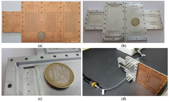 Pictures of the manufactured prototypes and assembly. Dielectric substrate with the elliptic patterns (a); top and bottom parts of the casing (b); detail of the transition at the top part of the casing (c); final measurement assembly (d).