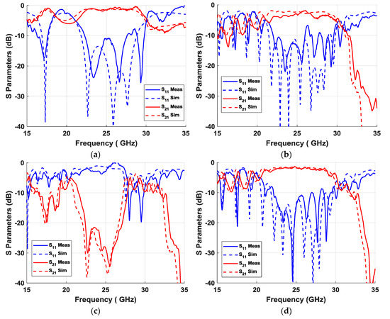 The measurement process was critical, requiring at least 35 measurements for each of the designs. Therefore, all connections had to be very stable to ensure that the conditions were the same in all 35 measurements. The results obtained from these 35 measurements were properly processed to combine the individual S parameters of each port in reflection and transmission parameters of an equivalent simultaneous excitation at the five input ports. This process was applied to the four designs, and the results obtained are represented in Figure 16, together with the results of the simulations. Figure 16a represents the results of the “thru” section, Figure 16b represents the results of the glide configuration section, Figure 16c represents the results of the non-glide section, and Figure 16d represents the results of the regenerated glide-symmetric design. The simulations were carried out including the losses in the dielectric (tan(δ) = 0.0035) and in the conductors (copper and aluminum). The results obtained fit very well with the simulations, with the exception of a small upward shift in frequency of approximately 0.5 GHz for all cases. The appearance of a band with an attenuation greater than 20 dB between 22.5 and 27.5 GHz was observed in the non-glide prototype (Figure 16c) with respect to the glide prototype (Figure 16b), whose effect was eliminated by regenerating the symmetry (Figure 16d). As indicated in Figure 10, an additional stop-band can be found at frequencies around 17.5 GHz in the non-glide case. The effect of this secondary stop-band was lower with an attenuation level between 15 and 20 dB, but it was present in the measurement due to the merging of the forward mode in the air and the backward mode in the dielectric. Finally, the appearance of a third stop-band in the three cases studied around 35 GHz was also of interest, which was produced again by the fusion of forward and backward modes in air and dielectric.