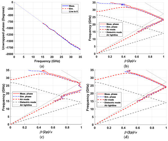 Of equal interest was the effect of these periodic elliptical structures on the phase. These results are depicted in Figure 17. For this study, the phase difference introduced by the “thru” section, represented in Figure 17a, was used as a reference. The first step was to eliminate the phase shift introduced by the “thru” section from the measured phase of the elliptical configurations. With this, we obtained the phase difference produced only by the 55-mm section with ellipses (10 unit cells). These results are represented in Figure 17b–d, applying a normalization in the phase with the factor β(2p)/π. As with the magnitude values, the measured phase values represented in the dispersion diagrams in Figure 17b,c coincided very well with the dispersion diagrams obtained from the unit-cell analysis. The 0.5-GHz upward deviation in frequency appeared again, but the shape exactly fit the results obtained in simulation. In addition to the measurement result, the graphs also included the result obtained from the full wave simulation of the S parameters of the complete designs, which matched better than the dispersion diagrams of the unit cells. In the glide (Figure 17b) and regenerated glide (Figure 17d) cases, a non-dispersive behavior up to 30 GHz was observed. The measured curve was closer to the light line in the regenerated glide configuration than in the original glide configuration, reaching the normalized value of 1 at 24.4 GHz in the first case and at 23.6 GHz in the second case (light line at 27.3 GHz). This means that there was a higher refractive index in the original configuration, which could be modified by varying the parameters of the unit cell. Of special interest was the dispersion diagram measured for the non-glide prototype (Figure 17c), in which the two stop-bands produced around 17.5 GHz and from 22 GHz to 27 GHz were clearly observed. In the range between these two stop-bands (18 to 22 GHz), there was a considerably higher refraction coefficient than in the glide configurations, which could be used to implement a structure with a higher phase-shifting capacity.