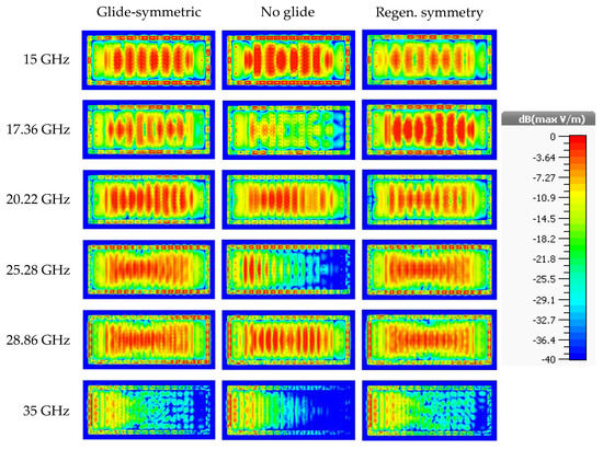 Figure 18 shows a comparison of the behavior of the electric field within the air gap, more precisely in a cut in the middle of the air gap (0.1 mm). The frequencies were conveniently selected to show the most interesting phenomena found in these structures: propagation at frequencies below the appearance of stop-bands (15 GHz), the maximum attenuation of the field found in the secondary stop-band (17.36 GHz), propagation between the two stop-bands (20.22 GHz), the maximum attenuation in the fundamental stop-band (25.28 GHz), propagation at a frequency above the two stop bands (28.86 GHz), and attenuation in the third stop band (35 GHz). The fields propagated homogeneously in the two glide configurations except in the capture at 35 GHz where a stop-band was present in all cases. For the non-glide prototype, the level of the electric field progressively decayed along the structure for the frequencies contained in the stop-bands, especially in the fundamental stop-band (25.28 GHz), which was exhaustively studied throughout this paper.
