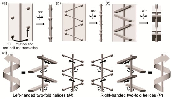 A two-fold helix is a symmetry operation of 180° rotation around a helical axis combined with one-half unit translation and is achiral in ‘mathematical’ crystallography (Figure 1a–c) []. On the other hand, a two-fold helix is chiral and has clear left- and right-handedness in ‘chemical/material’ crystallography [,] by considering molecular shapes (Figure 1d). This difference is attributed to an approximation method of molecules: one-point and multi-point approximation in the former and the latter, respectively. We call the chirality, whose handedness cannot be recognized in a general way by mathematical crystallography but definitely exists in materials, as hidden chirality. Not only clear helices, including three-fold, four-fold, and six-fold helices in crystals as well as α-helices in proteins, but also helices having hidden chirality like two-fold helices, may serve as the origin of chirality [,,].