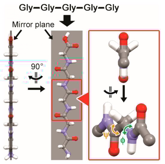 Pentaglycine with all trans (φ = 180° and ψ = −180° (or φ = −180° and ψ = 180°)) formed an extended linear structure (Figure 2). The linear structure had two-fold helical symmetry, i.e., a glycine moiety corresponds to the neighboring one by the operation: 180° rotation around the two-fold axis chain followed by translation along the main chain. Such a two-fold helix was achiral because there was a mirror plane along the two-fold helical axis.