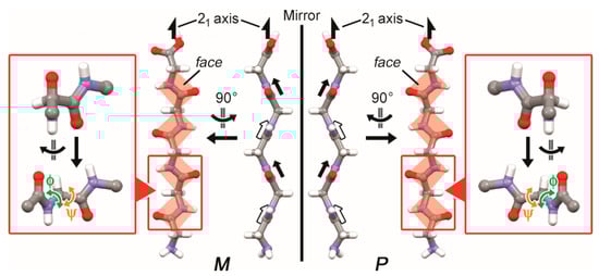 Handedness of the two-fold helicity in the β-strand was defined by application of the same concept of the supramolecular-tilt-chirality method, i.e., helical handedness was defined based on tilt of lines or faces in front of helical axes. Relative positions of the faces against the helical axis, front and back, were distinguished based on the position of an oxygen atom in the face when the β-strand was viewed from the direction that was vertical to the helical axis and parallel to the faces. When the faces in front of the helical axis were tilted to the left, the β-strand was defined as a left-handed (M) two-fold helix (φ = 120° and ψ = −120°, Figure 3 left). Its mirror-imaged one was a right-handed (P) two-fold helix having faces tilted to the right in front of the helical axis (Figure 3 right). In this case, dihedral angles of the β-strand were φ = −120° and ψ = 120°.