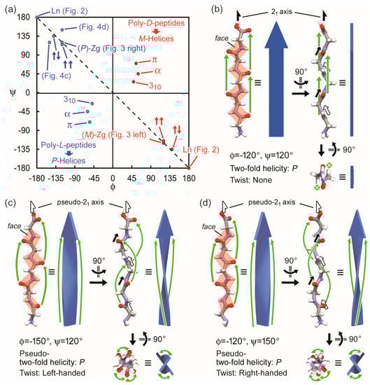 (a) The Ramachandran plot indicating φ and ψ values of the linear polypeptide (Ln, φ = 180° and ψ = −180° or φ = −180° and ψ = 180°), the zig-zag β-strands ((M)-Zg, φ = 120° and ψ = −120°; (P)-Zg, φ = −120° and ψ = 120°), the representative secondary structures: β-strands in a parallel β-sheet (↑↑, φ = −120° and ψ = 115°), antiparallel β-sheet (↑↓, φ = −140° and ψ = 135°), α-helix (α, φ = −60° and ψ = −45°), 310-helix (310, φ = −49° and ψ = −26°), and π-helix (π, φ = −55° and ψ = −70°). The linear pentaglycine (Figure 2) and (M)- or (P)-zig-zag pentaglycine (Figure 3) correspond with Ln and (M)- or (P)-Zg, respectively. Blue and red circles are in mirror-imaged relation to each other. (b–d) Relationship among dihedral angles (φ, ψ), (pseudo-)two-fold helicity, and twist: (b) (P)-Zg (φ = −120° and ψ = 120°) with no twist; (c) a β-strand with P pseudo-two-fold helicity and left-handed twist (φ = −150° and ψ = 120°); (d) a β-strand with P pseudo-two-fold helicity and right-handed twist (φ = −120° and ψ = 150°).