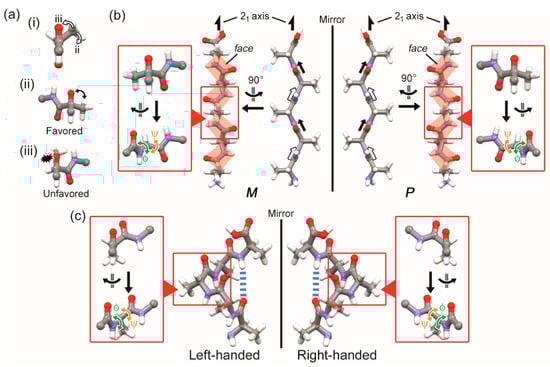 (a) Selectivity in rotation direction of dihedral angles for transformation of poly-L-alanine: (i) an extended linear structure to (ii) a favored and (iii) unfavored zig-zag structure (β-strand); (b) Two-fold helicity of zig-zag pentaalanine β-strands: left-handed (M, φ = 120° and ψ = −120°) and right-handed two-fold helices (P, φ = −120° and ψ = 120°) comprised of D-alanine and L-alanine, respectively; (c) Left-handed (M, φ = 60° and ψ = 45°) and right-handed (P, φ = −60° and ψ = −45°) α-helices of penta-D-alanine and penta-L-alanine, respectively.
