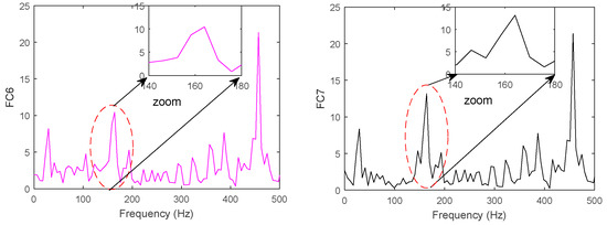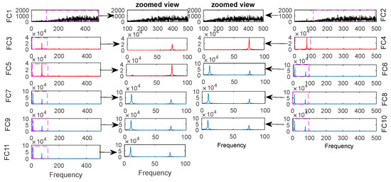 Here, CEEMDAN is used to decompose the vibration signal (ensemble size is 100, and the amplitude of the added noise is 0.2). The eleven IMFs and one residue were obtained (as shown Figure 12). It was found that it does not reflect the real component of original signal for each IMF completely, and that it contains some spurious information (such as IMF10). To extract the IIM of the vibration signal, the CIMFs were first obtained using Equation (16), and then FFT and the corresponding local zoom (main information) were conducted for each CIMF (as shown in Figure 13). It was found by comparing FC1 with FC2 that there were additional frequency bands. Similarly, the frequency component in FC6 is different from that of FC7 (the detail difference is shown Figure 14). That in FC8 is also different from that in FC9; this means that the feature difference is easy to distinguished among IMFs using the proposed method.