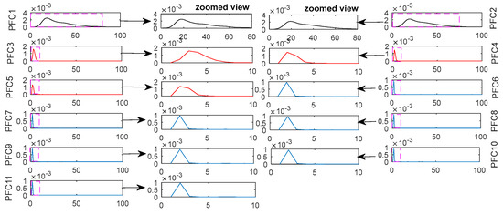 Here, the PDF is used to estimate each FC (the obtained waveform is designated as PFC) to enhance discernment of the difference features among FCs (especially for FC3, FC4 and FC5) and subsequent quantitative ability. Figure 5 shows the estimated PDF and local zoom of the interest components in each PFC. It was found that the geometry feature of each PFC was more obvious than that of the corresponding FC.